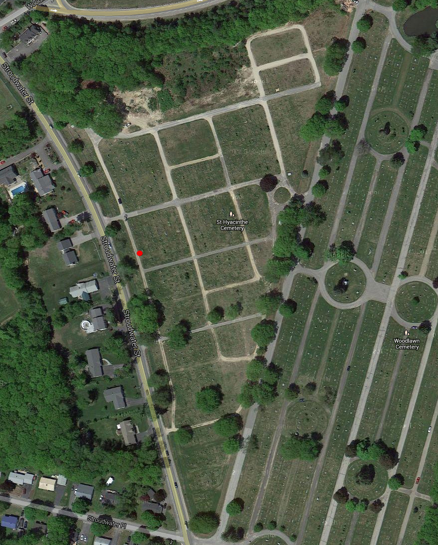 There is a dirt road that runs along the front (west) section of the cemetery, Rudy is buried along this road near the intersection with St. Damasus Ave., there are six markers in front of the Vallée family stone, Rudy’s is the one on the far right.