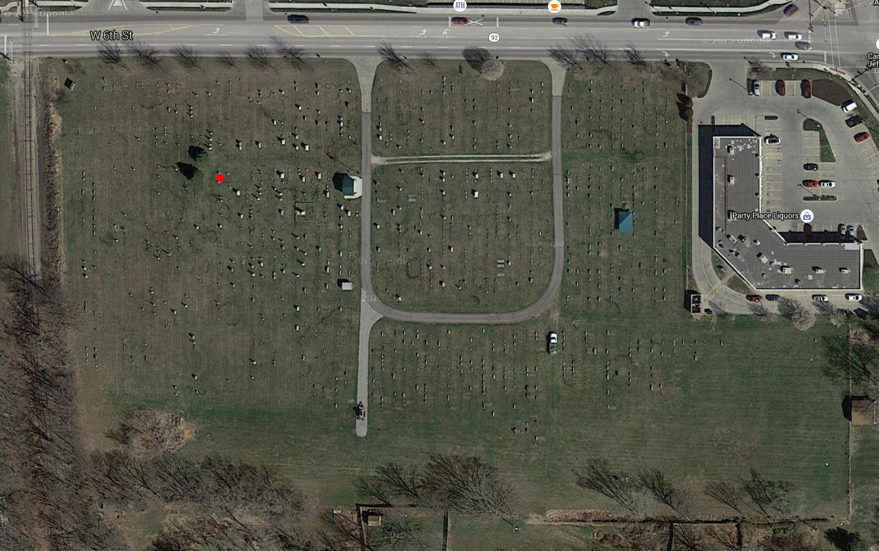To the west of the main shelter as you enter the cemetery, right next to a large cedar tree.