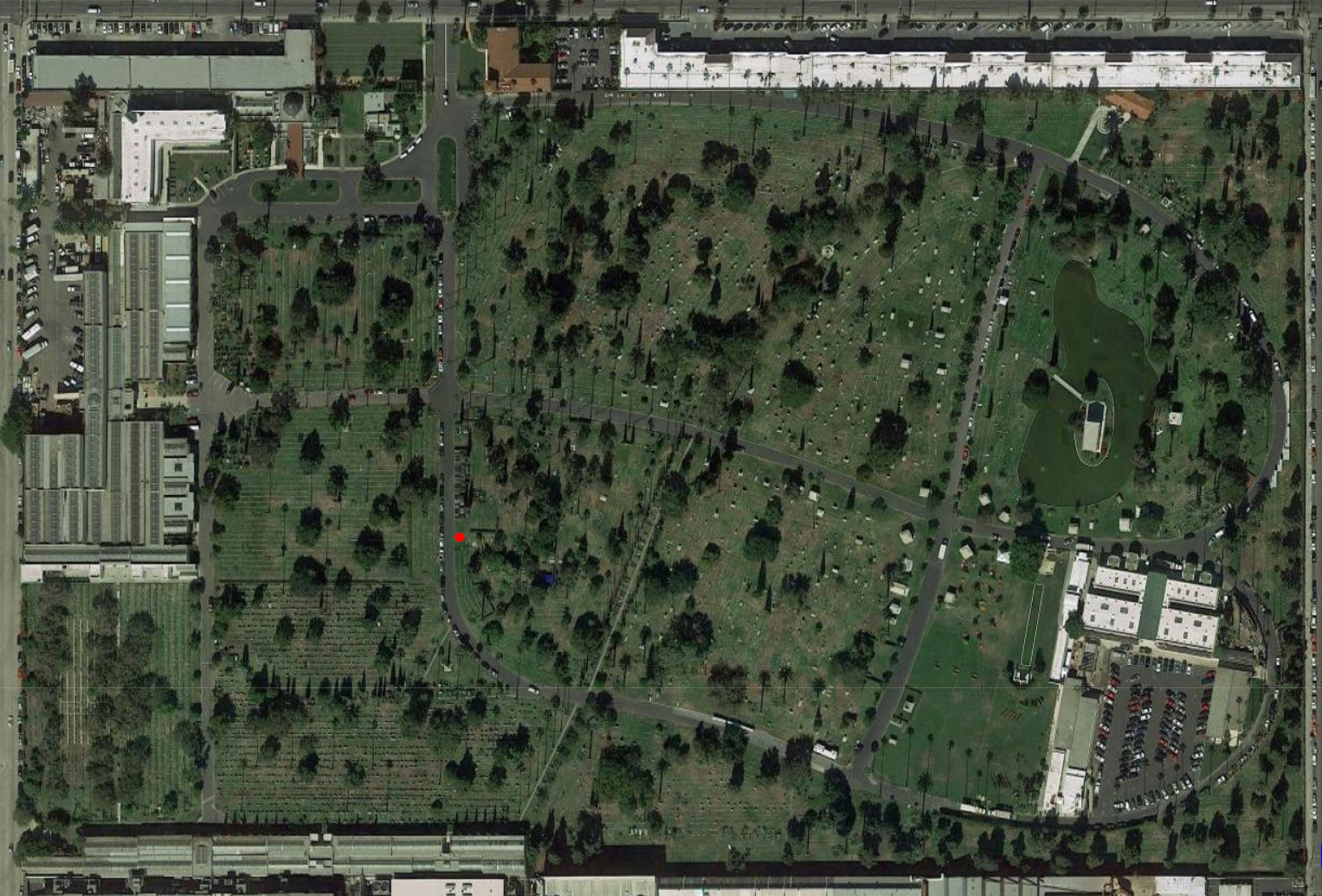 Garden of the Exodus, L-149; take Pineland Avenue south from the main entrance, past Maple Avenue and Mel is buried right next to the road on your left.