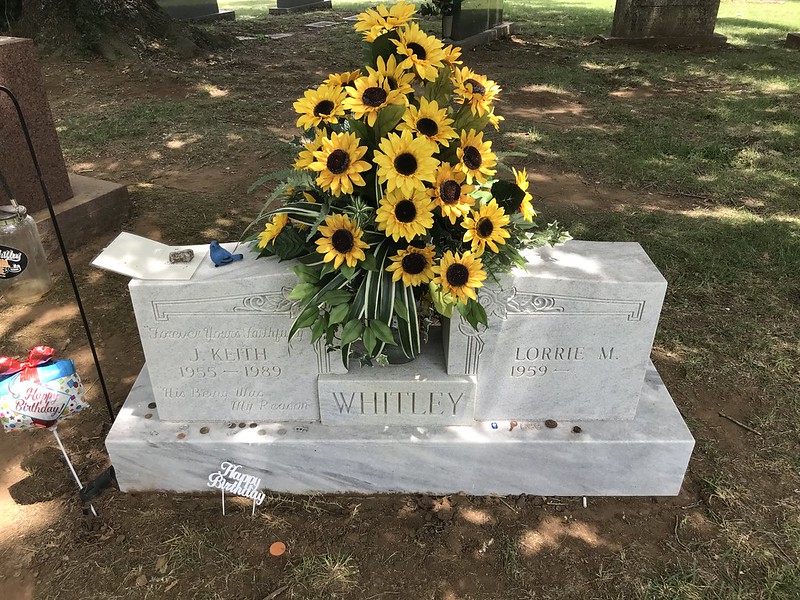 Enter the cemetery and turn right. Follow the road, keeping left, until you reach a “T” intersection, then turn left. Veer to the right when you reach the Crestview section and stop when you see a marker for HENLEY on your right just before a large tree. Keith is buried two rows behind this marker.