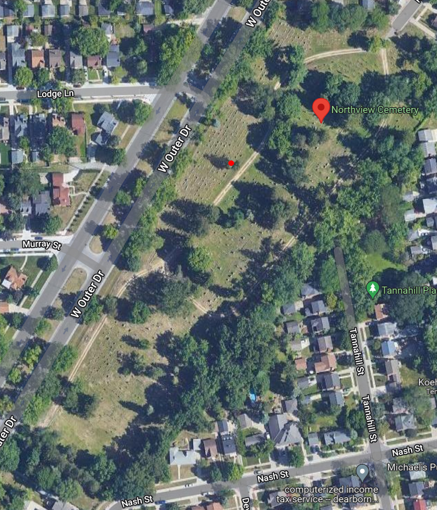 Enter the cemetery and follow the one-way road to the right. About halfway along there’s a single tree on the right side of the road. George and his parents’ plot is just behind this tree.