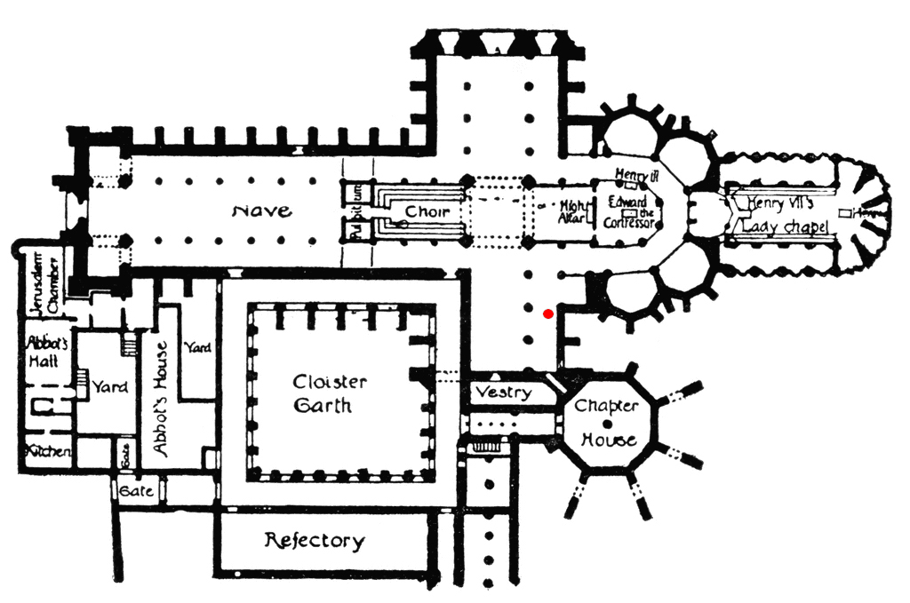 The South Transept (aka “Poets’ Corner”) – On the eastern edge of this section (near Chaucer) just to the right of Alfred Tennyson.
