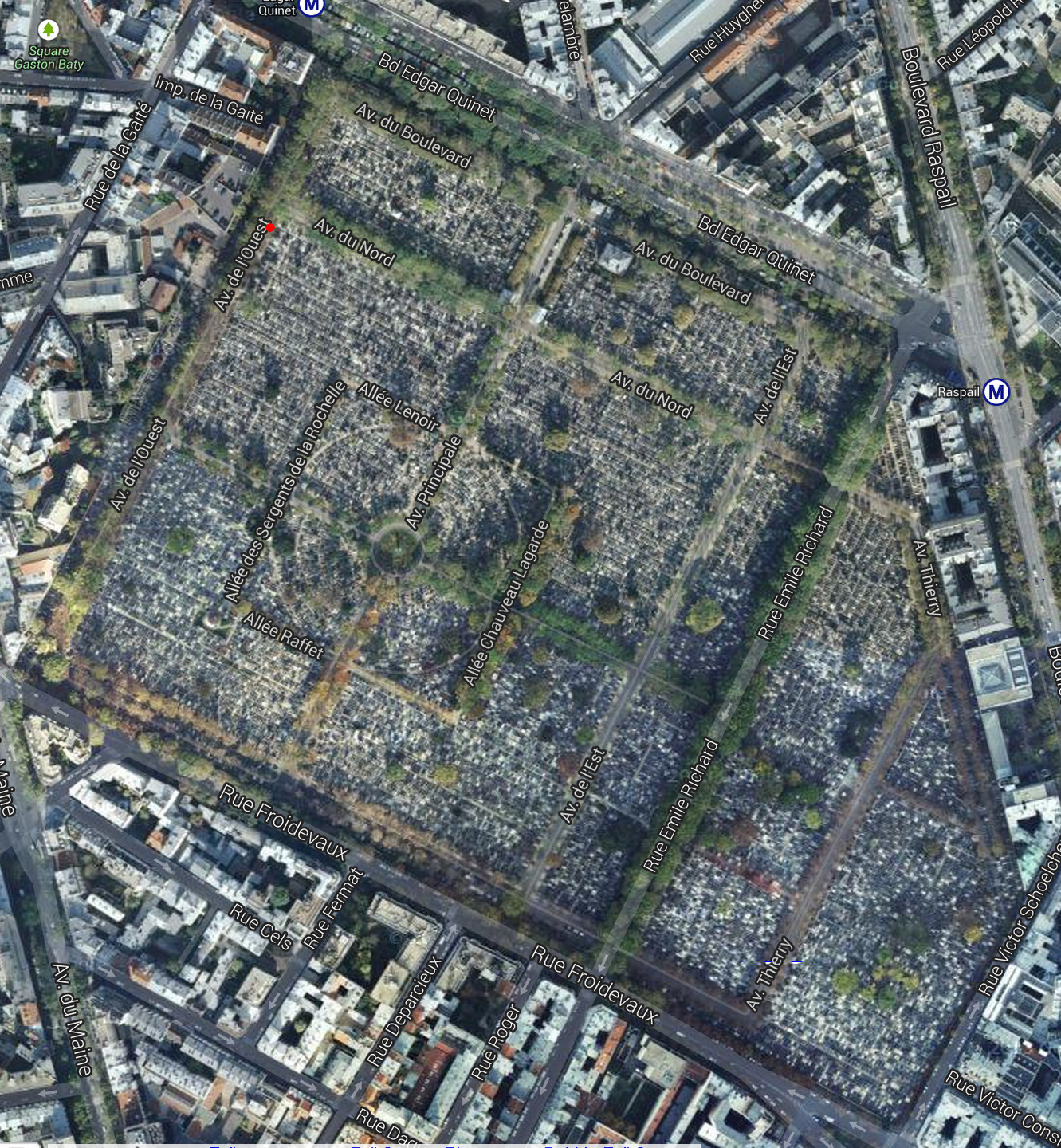 Division 6; Along Avenue de l’Ouest at the western edge of Division 6. There is also a large cenotaph dedicated to Baudelaire in the cemetery.